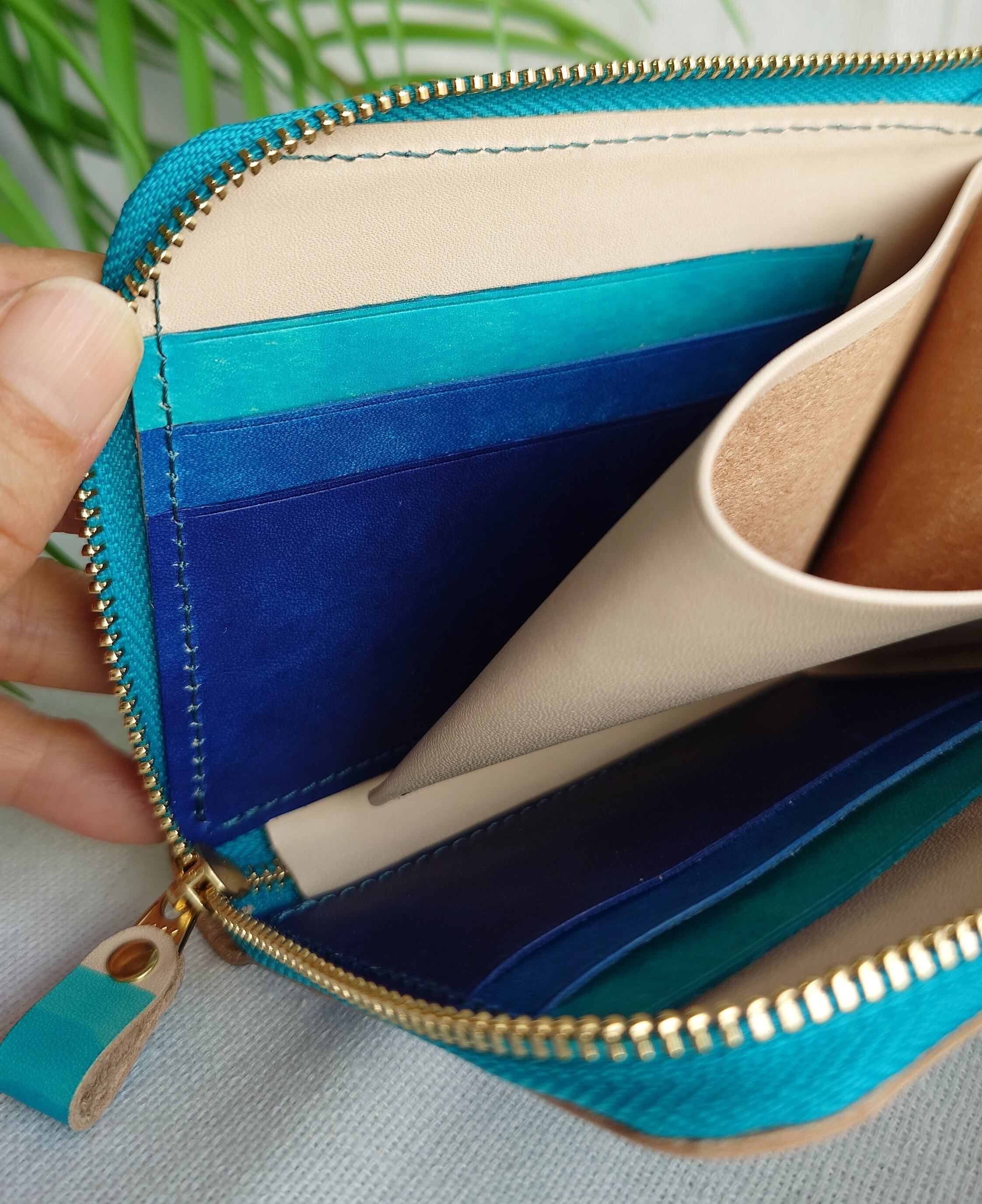 内側のポケットも3色の海の色に染めています。